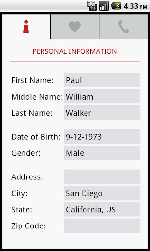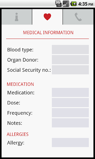 本应用安全的将您的医疗信息存储在您的手机中,让您能在出现紧急情况之后在世界任何地方读取您的医疗信息。同时,本应用也提供了一个应急插件,可用短信警示您的紧急联系人并告知他你的地理位置。