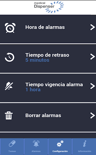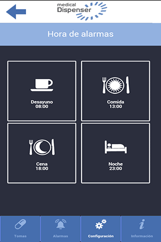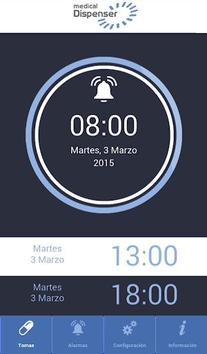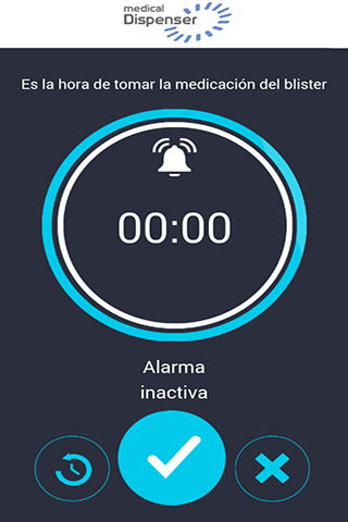 La aplicación genera, a partir de un codigo QR que el paciente recibe con su blíster, las alarmas de toma de medicamentos en las horas definidas por su farmacéutico.
