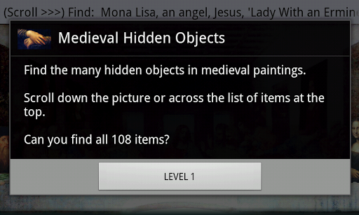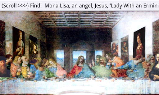 Find the many hidden objects in medieval paintings in this educational and fun art game. Solve centuries old clues hid by the masters Leonardo da Vinci, Raphael Sanzio, Sandro Botticelli, and Pieter Bruegel in 10 of their paintings. Scroll down the picture or across the list of items at the top. Can you find all 99 items?
