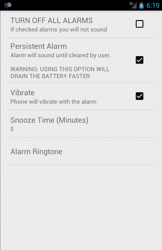 Includes options for custom alert sound, to ignore the phone's Silent Mode (will turn on the volume and alert you) and a persistent alarm that will only go away when you acknowledge it.