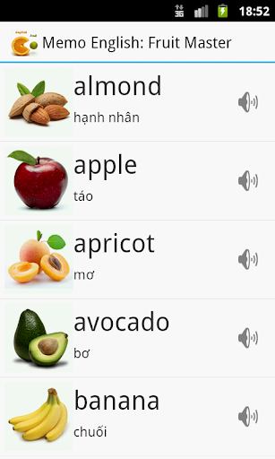 Memo English: Fruit Master is a simple but useful app to help you remember 75 most common English fruit words. This app provides fruit pictures, your language name and English words pronunciation. This app is design for people who want to learn: