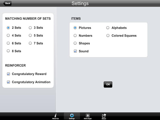 The default settings are: Number of Sets to Match is two, Items is “Pictures”, and Reinforcer includes “Congratulatory Reward for Each Match” and “Congratulatory Animation for Completion” .