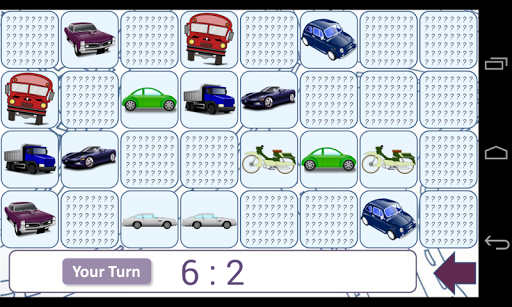 Game starts with all cards turned face down. When you tap one - it will turn and you need to remember the picture on it. Then - you should try to find the card with same picture as the uncovered one, and if they match - both will remain opened, you get one point and its still your turn. If you fail, the cards turn back and then it is your opponent turn. Look at your opponent moves to learn about other cards locations.There are various strategies - sometimes its better to loose at the beginning and then clean whole board in one long turn. Otherwise both cards will flip back over and you will get another try. Try to find all matched cards as fast as possible.