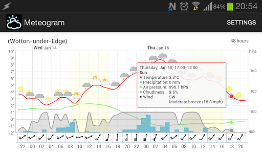 With the app, a meteogram is opened up in full screen, and is interactive. Clicking on any time point will open a pop-up with more detailed information about the weather at that time point.