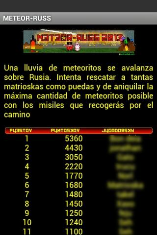 Una lluvia de meteoritos se avalanza sobre Rusia. Intenta rescatar a tantas matrioskas como puedas y de aniquilar la máxima cantidad de meteoritos posible con los misiles que recogerás por el camino.