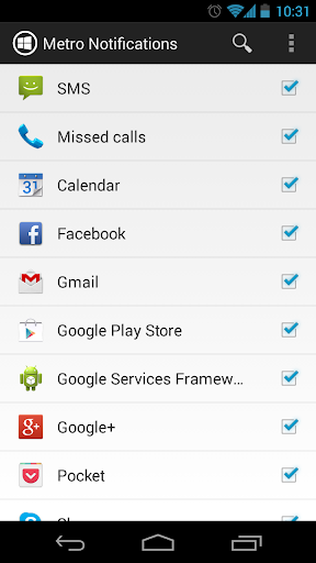 You need to activate Metro Notifications's accessibility service/notification access for it to be able to notify you. Status bar notifications must be enabled in the monitored apps for Metro Notifications to be able to process them.