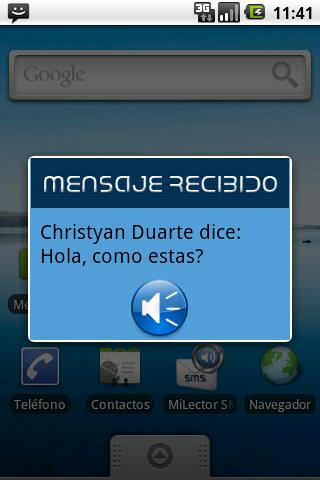 Al llegar un nuevo mensaje, se muestra una pequeña ventana mostrando el mensaje y el contacto que lo envió, así como el botón para la reproducción en voz del mensaje.