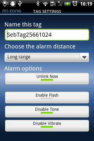 This application works together with the Mi-Zone security tag, especially designed to work with your Android handset. Mi-Zone is a 2-way proximity alarm that works