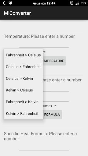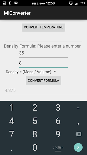 This application was developed for Chemistry and Physics students who have difficulty converting/calculating units and formulas during there lab experiments. This user-friendly, easy to use application will convert units of Length, Mass, Volume, Pressure, and Temperature. It will also calculate the Density, Specific Heat, Velocity, and Acceleration formula!