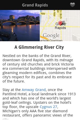 This app takes us away from the urban sprawl and blandness of big box stores and chain restaurants into what makes the state so exceptional. It can be a ma and pa restaurant where the cherry pie is from fruit grown just down the road or a cutting edge restaurant where the chef visits the local cheesery to select what's best to serve for dinner that night. It's kayaking along a fast moving river, skiing down a Michigan mountain, spending the night in a charming bed and breakfast that dates back two centuries. It's taking a boat down the river that Hiawatha once paddled, or peering through glass bottom boats at shipwrecks from the 19th century. It's the best of the coastal and heartland hamlets and big cities.