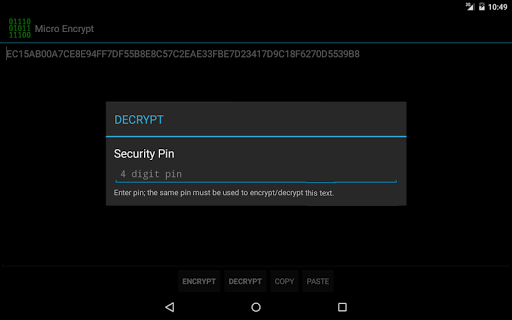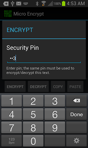 You must enter a pin when you encrypt the text. The same pin is required to decrypt the text on your device or any other device.