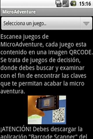 Se trata de un intérprete de juegos MicroAdventure, juegos de texto basados en la exploración, contenidos en códigos QRCode que se irán publicando en la web, requiere de instalar "Barcode Scanner" de ZXing Team. Tanto los juegos, el intérprete como Barcode Scanner son totalmente gratuitos.Los juegos son de corta duración, pero cada uno de ellos te pondrá en la piel de una situación distinta, suponiendo un nuevo reto en cada ocasión.