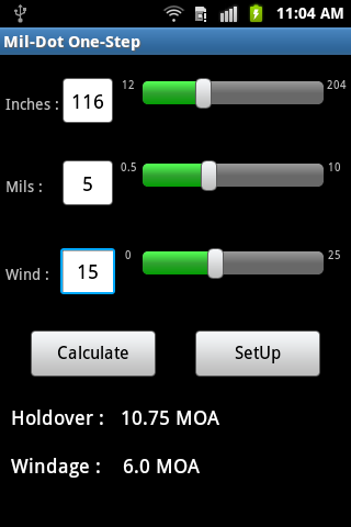 The third screen shot shows the sniper inputting 116 inches, five mils angle and 15 mph wind. This data corresponds to a BM-30 truck (used by the Russians to transport the Smerch multiple rocket launcher or the SCUD missile), which is 116” from the ground to the top of the driver’s compartment. The Mil-Dot One-Step reports that holdover is 10.75 MOA and windage is 6.00 MOA.