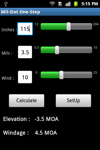 The Mil-Dot One-Step returns the elevation and windage adjustment in MOA, rounded off to the fineness of the scope's adjustment dials.