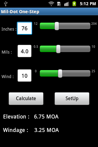 The second screen shot shows the sniper inputting 76 inches, four mils angle and 10 mph wind. This data corresponds to a BTR-80, which is 76” from the ground to the top of the hull. The Mil-Dot One-Step reports that holdover is 6.75 MOA and windage is 3.25 MOA.
