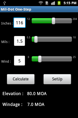 The fifth screen shot shows the sniper inputting 116 inches, 1.5 mils angle and 5 mph wind. This data corresponds to BM-30 truck (used by the Russians to transport the Smerch multiple rocket launcher or the SCUD missile), which is 116” from the ground to the top of the driver’s compartment. The Mil-Dot One-Step reports that holdover is 80 MOA and windage is 7 MOA.