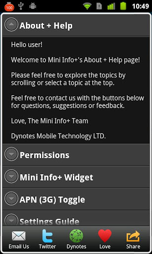 - Wifi, Bluetooth, GPS, Screen Brightness, Airplane Mode, APN (3G/EDGE), Auto Rotation, Auto Sync, Screen Timeout, Unlock Pattern, Mini Info Menu