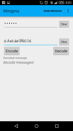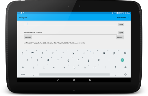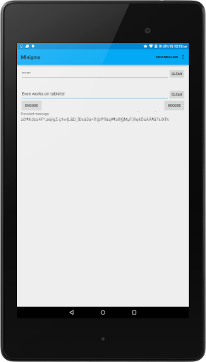 Minigma is a dynamic encryption app, now with material design and ready for Android 5.0! It can take single-line messages and encode or decode them based on a password. It is an entirely local app, it does not require use of the Internet or the cloud at all. The messages are not stored in this app in any way nor are they transmitted anywhere, providing peace of mind and security. Do you need to store some sensitive info? Just put a password in the app, and hit the share button to send it to any note-taking app!