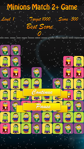 Minions Match 2+ Game Game is a well designed matching game. Match 2 or more pics with same image to make them disappear and earn score points. They more pics you make them disappear at the same time, the higher score you get. You can get level up once the target score reaches. it is suitable for all ages.