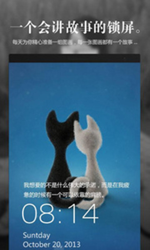 1.新鲜:每天推送精彩且富有内涵的一组随机壁纸,每一张壁纸都有一个故事(文章);同时你也可以自定义你喜欢的壁纸加入随机壁纸库。