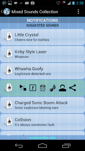 You will be able to customize ringtones, alarms, notifications and even each of your contacts with the cool sounds, noises and beats included on Thousounds. Also, you will be able to send a sound through email or deploy it into some cloud service (e.g, Google Drive, DropBox, etc).