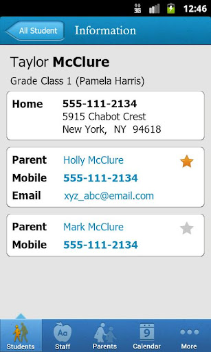 App users can access their school directory information for students, faculty, and parents, as well as parent-teacher association information and the school calendar – and the information displayed is always the most current and up-to-date. Users can call, text or email individual members of the school community from within the app. Users can also sync school Calendar events with their Google Calendar, and create in-app favorites.