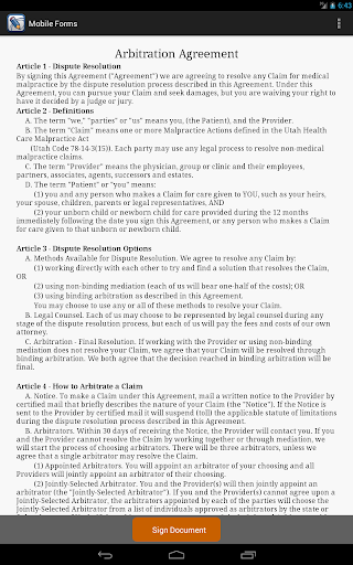Mobile Forms allows your customers, patients, clients, etc. to read, fill, and sign your custom forms on an android tablet. Completed documents are saved as PDF files which can be "sent" using the Android Share action. Mobile Forms was originally developed for medical clinics to save paper and scanning by having patients sign paperwork electronically, but it can also be useful in other areas as well. Mobile Forms was designed for 10inch tablets. It may not display properly on smaller devices.