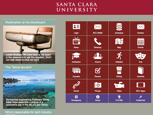 Get Santa Clara University news, events, map, directory, course listings, dining services, library catalog, room reservations and more. Find your way on campus and in buildings using the map's point to point routes. Contact faculty and staff using the directory. Stay up to date on alumni and athletics news. Save a list of classes using the Course Catalog watch list. Navigate to SCU Login web sites.