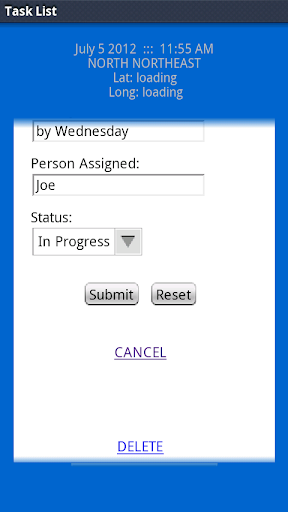 Use this handy app to create a task list for everyone in the company (or family!) ... great for drivers and sales personnel so they can look at the task list when they have time. App displays current date/time and even course (NSWE) and if your GPS is enabled your coordinates will be displayed as well. Tasks can be entered and assigned or anyone can update an entry with their name and change the status from Available to In Progress ... or Done.