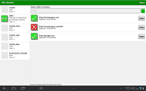 URL Monitor is a simple diagnostic application that will allow you to quickly and easily monitor the status of various URL endpoints. Simply enter a URL into the text box and add it to the list. A polling HTTP request will be made every 10 seconds to determine the availability of a given endpoint. HTTP codes 200, 202, 204, 205 and 206 will be identified as a success with a green check. All other HTTP codes will indicate a problem as a red 'X'. To remove a listing, simply perform a horizontal swipe on a given row to reveal a delete button. All monitoring is paused when the application is in the background.