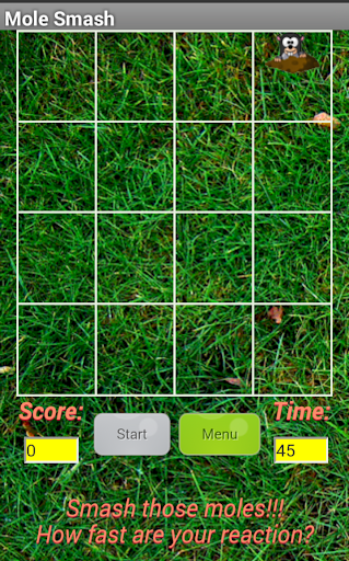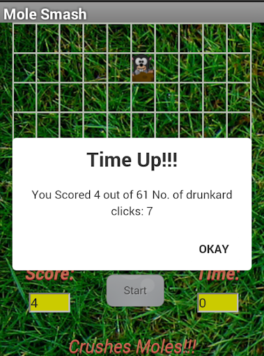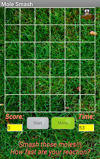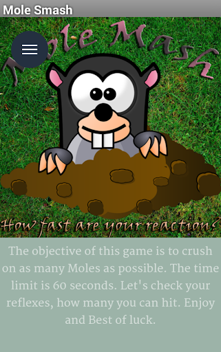 The objective of this game is to crush as many moles as possible, the time limit is 60 seconds. Let's check your reflexs, how many you can hit. Smash those moles!!!!