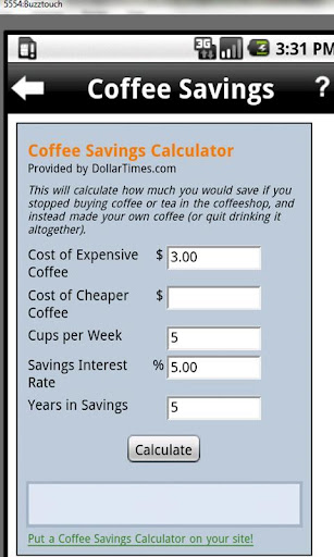 This app is to help you see the financial cost of little things we do each day in order to make some money saving adjustments...or not :-) This gives real numbers and is intended for fun and information. There are calculators for Gas Mileage, your daily Coffee habit, Lunch costs, Commuting costs and Cigarette habit expense. Simply go into the calculator you need and enter the info for each line and you will have an instant answer. Thanks to Dollartimes.com for their helpful calculators. Thanks and please share this app if you like it!