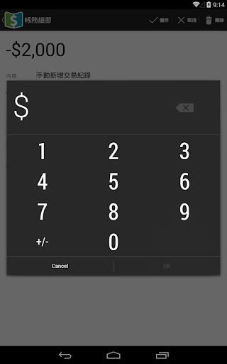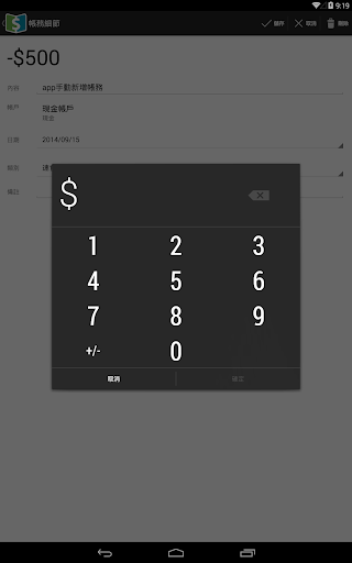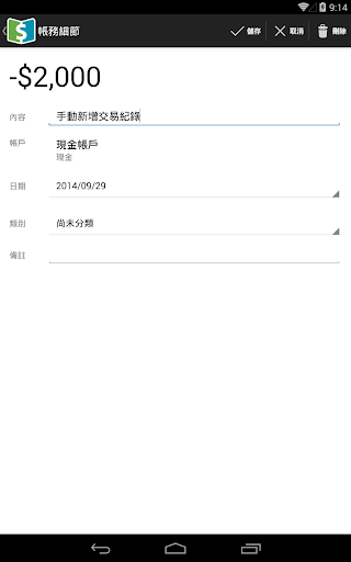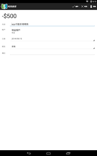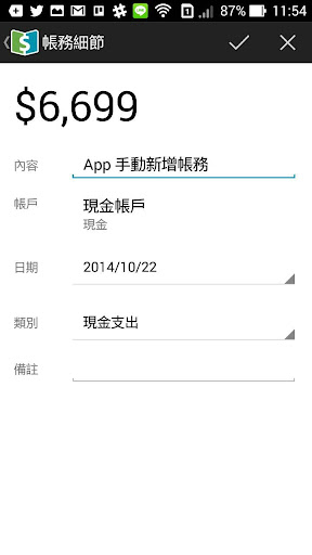 • 手動記帳:輸入金額、按下儲存,讓您快速完成記帳工作。當然,您也可以設定帳務類別、添加備註等等。