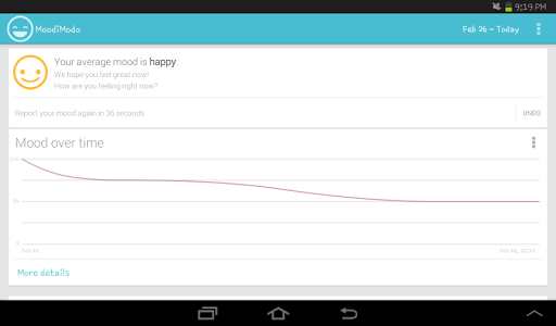 In addition to the ability to track basic overall mood, MoodiModo also allows the user to submit a more detailed and precise measurement of their mood when time allows. This is done by answering questions related to the 20 different feelings and emotions defined by the Positive and Negative Affect Schedule (PANAS).