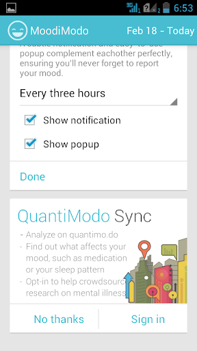 When you first install the app, you get to set the reminder frequency and indicate their preferred means of notification, as well as report your first mood.