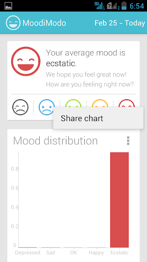 Users have the ability to review their mood trends retrospectively, allowing them to identify triggers for symptoms and quantify the effectiveness of treatments. MoodiModo allows you to share graphs of your mood.