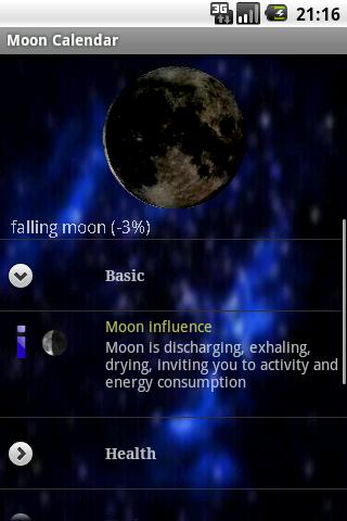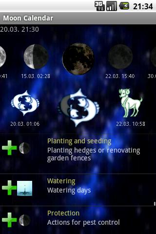 Moon Calendar application is a tool for you to get in touch with nature again. Position of the Moon (its phase and zodiac sign) has influence on most things on Earth - from tidal waves, animals, plants to us and all our activity. Moon Calendar contains a collection of advices and rules that influence all major parts of our life - from health, collecting herbs, doing house chores to growing plants in the garden.