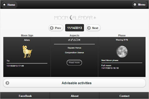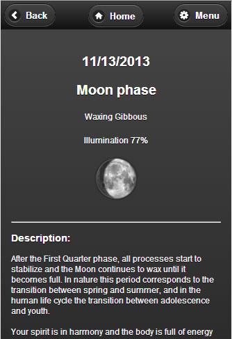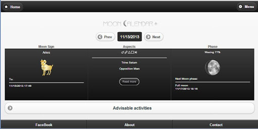 In the app there is a calendar that shows the position of the Moon, its sign, phase, aspects with other planets and their meaning, recommended activities for the current day and every day afterwards.