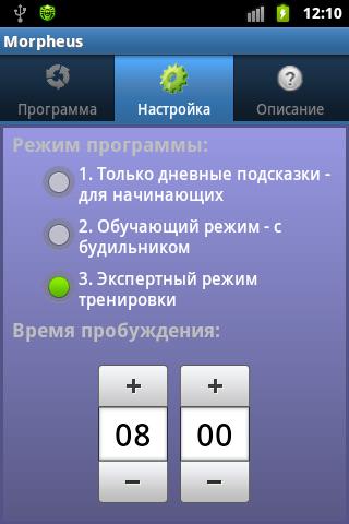 Программа «Morpheus» имеет 4 режима работы – от режима для начинающих, в котором работа происходит только днем и, завершая экспертным режимом тренировки, в котором предполагается уже собственно работа с осознанными сновидениями с той или иной целью.