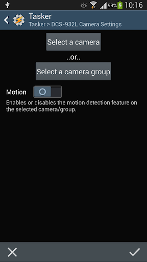 The settings available are motion detection on/off and motion detection sensivity. You can either toggle settings directly in the app itself, or you can use it with Tasker/Locale (only motion detection on/off).