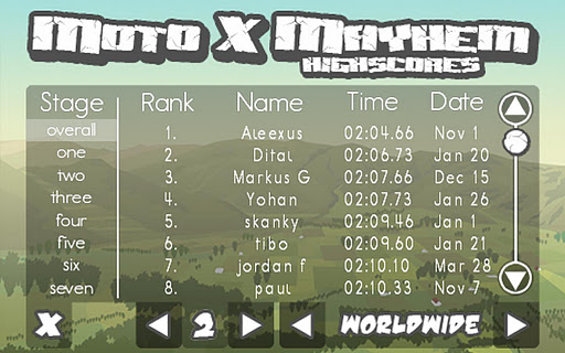 使用加速度计技术来平衡你的摩托车,你飞过巨大的爬升和跳跃!作为您的冲击享受真实的物理反冲看你或你的周围,当你崩溃骑手反弹。竞争,是与极限摩托Mayhem的在线记分牌最快的越野赛车手。