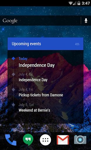 This homescreen theme contains a gorgeous mountain landscape wallpaper along with a ton of great functionality with no setup required. After you apply this theme, you’ll have fast access to phone, SMS, email, and your camera. On the main screen there’s a shortcut to Google search. On the flanking two homescreens you’ll see your agenda, current weather conditions, and music controls with album art (which lets you control any music app you may have).