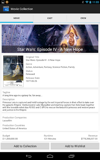 Allows user to create and view a personal list of their movie collection. Information includes Cast, Crew, and stats for each movie with posters. The Information and images are provided by TMDB.