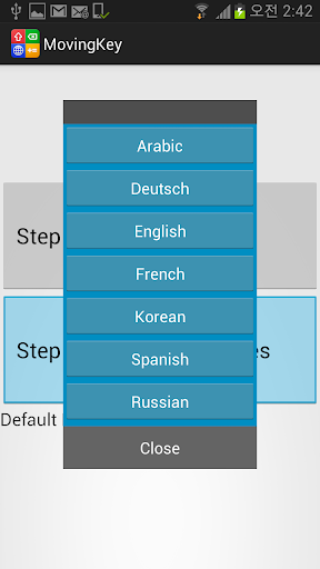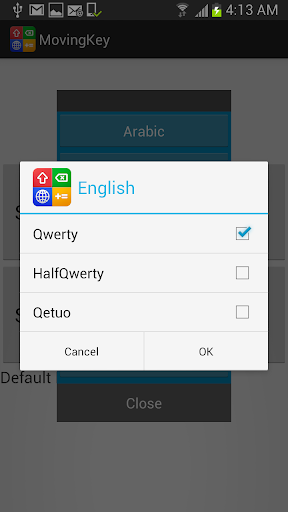 MovingKey icon --> Step 3 button --> language selection --> Qwerty, Half Qwerty, or Qetuo