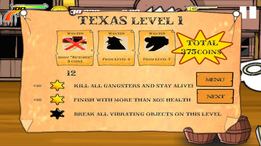 Our missions for Texas map are various: kill gangsters in the predefined order, break all vibrating objects, complete level on time or stay alive with remaining health... and many rewards on the game!