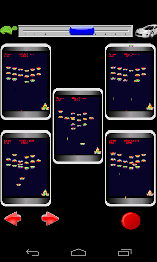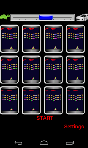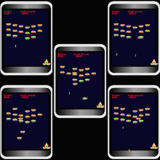 Multi Invaders. Play 12 screens at once. The invaders are coming so fast, you no longer have the luxury of playing on just 1 screen. You control 12 blasters all at the same time. As individual blasters get destroyed, the remaining games will grow and re-arrange themselves around the screen to always give you the best possible view of your fleet.