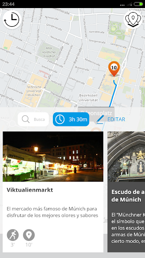 JiTT no sólo le cuenta las historias de la ciudad a lo largo de la visita, sino que también tiene en cuenta el tiempo del que usted dispone. Tanto si está en un viaje de negocios y tiene poco tiempo para visitar los lugares históricos, como si hace una corta visita a la ciudad y quiere aprovecharla al máximo. JiTT creará una ruta adecuada a sus intereses y disponibilidad. Si ya ha visto algunos de los lugares indicados, simplemente elimínelos dela ruta, o si quiere visitar algún sitio en particular, añádalo. ¡La aplicación recalculará la ruta y le mostrará los puntos de interés de Múnich!