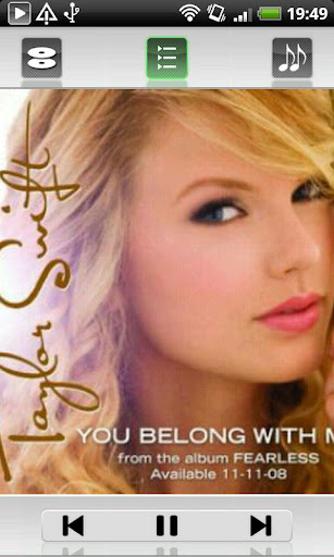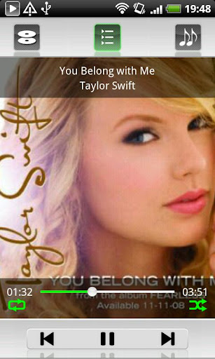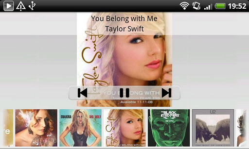 * A playback window with album art, song title and artist's name displayed and a number of play buttons allowing full control over playing. The top song title panel and bottom progress panel can be hidden (or shown) by swiping on them whenever you wanted.