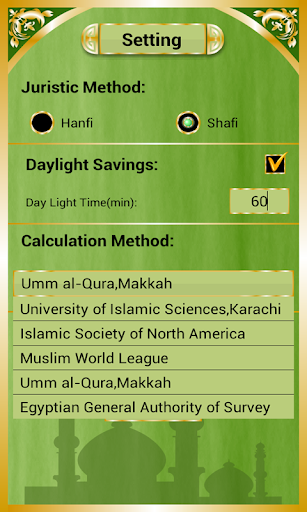 You can set alarm of either azan or voice message. We have added Daylight Saving option also to help our users. If there is slight difference in times, you can adjust it by clicking on that prayer and also can set Auto silent option from there.