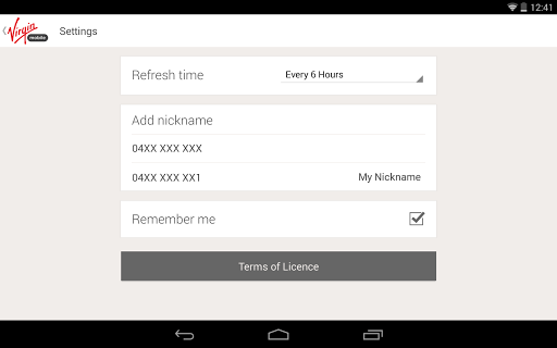 The My Account app can store your log in details (your mobile number and PIN) so that you don’t have to re-enter them every time you use the app. This feature is called ‘Remember me’. It is enabled by default, but you can turn it off (and on again) via the ‘Settings’ menu. Please note - if ‘Remember me’ is enabled and someone else uses your phone - with or without your permission - they will have access to your Virgin Mobile account information via the app.